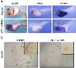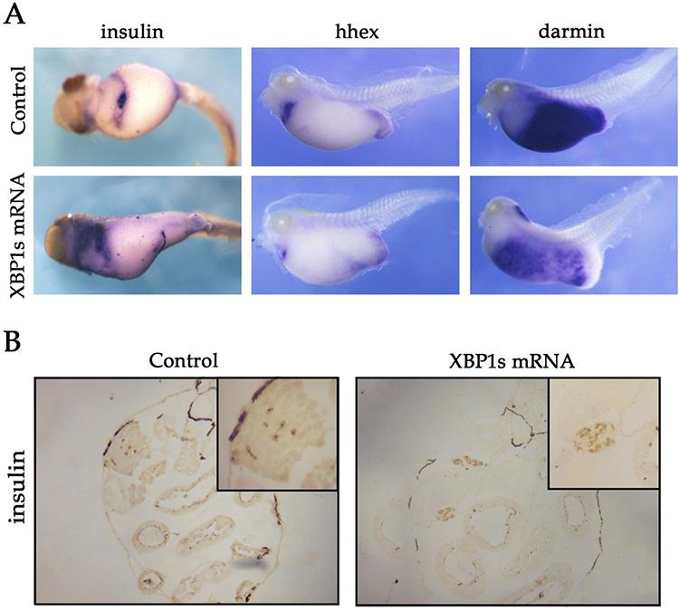 Effect of XBP1s overexpression on pancreatic development (A) Whole-mount in situ hybridization revealed higher expression level of insulin, and lower expression levels of hhex and darmin, when XBP1s was overexpressed at stage 11. (B) Immunohistochemical analysis revealed high expression of insulin after XBP1 overexpression.