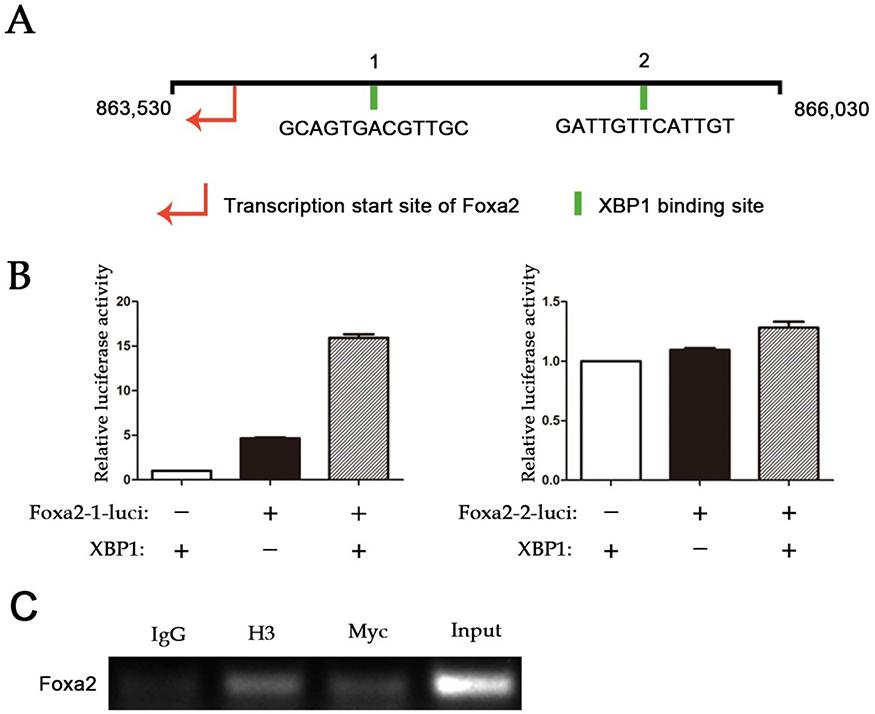 Transcriptional regulation of foxa2 by XBP1s (A) Bioinformatics analysis of the binding site of XBP1 in the foxa2 promoter region. (B) Luciferase assay was used to detect whether two binding sites of foxa2 are effective. These two possible binding regions were cloned into the pGL3-basic plasmid, and the 293T cells were co-transfected with the XBP1 plasmid and the binding site plasmid. (C) ChIP assay was used to detect the binding of XBP1 to the promoter region of foxa2 in vivo. XBP1s-myc mRNA was injected into the embryos, and the embryos were collected at the stage of neuroblasts. Then, the experiments were performed using myc antibodies, and primers were designed upstream and downstream for site 1 for PCR detection.