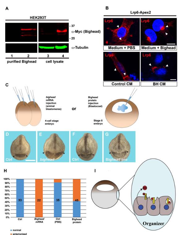 Vertebrate embryonic development is regulated by a few families of extracellular signaling molecules. Xenopus laevis embryos offer an excellent system to study the cell-cell communication signals that govern embryonic patterning. In the frog embryos, Wnt/β-catenin plays a pivotal role in regulating embryonic axis development, and modulation of the Wnt pathway is required for proper antero-posterior patterning. Recently, a novel secreted, organizer-specific Wnt inhibitor, Bighead, was identified that acts by downregulating Lrp6 plasma membrane levels. Here, I describe a method to purify biologically active Bighead protein and confirm that Bighead promotes Xenopus head development.