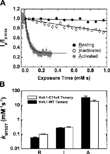 Figure 2. Gating state–dependent accessibility of the Kv4.1 channel T1–T1 interface to internal MTSET. (A) Time courses of C11xA ternary complex inhibition by internal MTSET in the activated (gray), inactivated (hollow circle), and resting (black) states. Solid lines are best-fit exponential decays with the following second-order rate constants (1/τ[MTSET]): 0.038, 0.366, and 22 mM−1s−1 in the resting, inactivated, and activated states, respectively. The remaining fractional current at steady state was 0.2–0.25 in all states. (B) Bar graph summarizing the second-order rate constants of wild-type and C11xA ternary channel inhibition by MTSET.