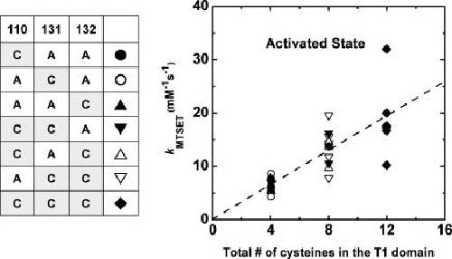 Figure 3. The kMTSET in the activated state against the total number of cysteines in the T1 tetramer. The gray boxes (left) represent the available cysteines in the T1–T1 interface for different mutants. Mutants with one cysteine are variants of C13xA and those with two cysteines are variants of C12xA. The dashed line is the best-fit linear regression with a slope of 1.65 mM−1s−1/Cys.