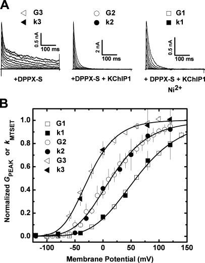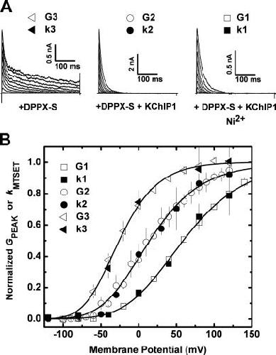 Figure 5. Voltage dependence of MTSET inhibition rate constants of the Kv4.1-C11xA channel. (A) Inside-out macropatch currents of Kv4.1-C11xA ternary, binary (+DPPX-S only), and ternary + Ni2+ (400 μM, external). Currents were evoked by step depolarizations from −100 mV to command voltages between −100 and +160 mV in 20-mV increments. (B) The kMTSET-Vm (filled) and Gpeak-Vm (hollow) relations for the Kv4.1-C11xA channels depicted in A. The solid lines are the corresponding best-fit fourth-order Boltzmann functions with the following midpoint voltages (V1/2) and slope factors (s): V1/2 = −26 (binary), 14 (ternary), and 59 (ternary + Ni2+); s = 32 (binary), 42 (ternary), and 51 (ternary + Ni2+) mV. The maximal second-order rate constants (mM−1s−1) are 22.32 (binary), 21.13 (ternary), and 29.7 (ternary + Ni2+), respectively. The kMTSET-Vm and Gpeak-Vm relations in all three conditions are strongly correlated. The best-fit linear regression of a plot of all Gpeak-kMTSET pairs has a slope = 1.002 and coefficient = 0.9954.