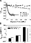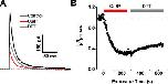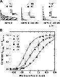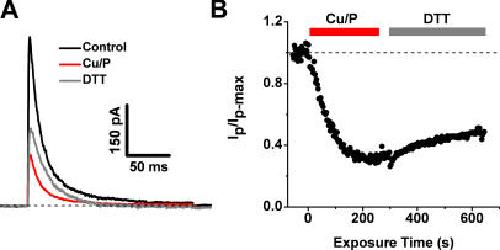 Figure 7. Reversibility of the Cu/P-induced inhibition of ternary Kv4.1 channels. (A) Outward currents evoked by a step depolarization from −100 to +80 mV. The currents were recorded in the inside-out configuration before (black trace) and after (red trace) the application of Cu/P to the intracellular side of the channels, and after exposing the same patch to 10 mM DTT (gray trace). The pH of the intracellular solution was 8.6 throughout the experiment. (B) The time course of the experiment shown in A. The currents in A are averages of ∼10 sweeps. From a total of three independent experiments, 32 ± 4% of the current inhibited by Cu/P was recovered upon the treatment with DTT.