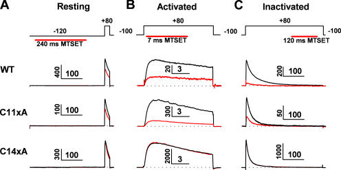 Figure 1. The T1 zinc binding site is accessible to internal MTSET in three distinct states. All channels were coexpressed with DPPX-S and KChIP-1. Wild-type (WT), C11xA, and C14xA currents from inside-out patches before (black) and after (red) the application of internal MTSET in the resting (left), activated (center), or inactivated (right) states. The units of current and time are pA and ms, respectively. Top, synchronized application of voltage steps (black line) and MTSET concentration jumps (red bar). The MTSET concentration was 200 μM for the activated state and 400 μM for the resting and inactivated states. The inhibition by MTSET during the test pulse is not apparent because the chemical modification and the resulting inhibition were slow relative to channel gating.