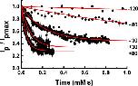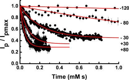 Figure 4. MTSET inhibition time courses of the Kv4.1-C11xA ternary complex at different membrane potentials. Solid lines are best-fit exponential decays with second-order rate constants (1/τ[MTSET]) of 0.038, 0.42, 4.66, 11.77, and 21.93 mM−1s−1 at −120, −80, −30, +30, and +80 mV, respectively. MTSET concentrations are 200 μM above −30 mV and 400 μM below +30 mV.
