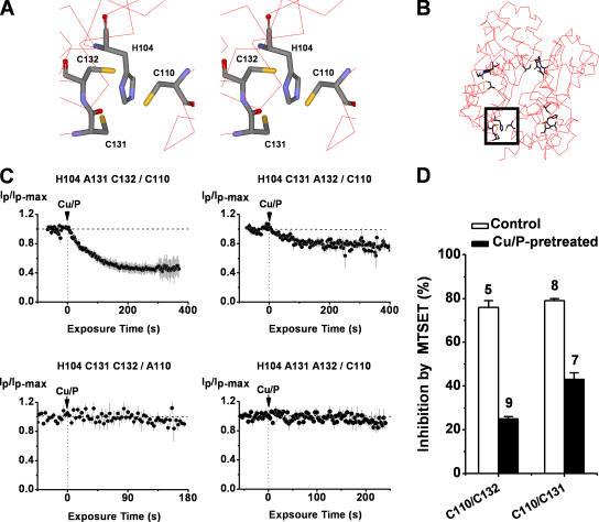 Figure 6. Disulfide bond cross-linking in the T1–T1 intersubunit interface inhibits ternary Kv4.1 channels. (A) Stereo view of the residues within the rectangle in B. C110 is from one subunit and C131, C132, and H104 are from the neighboring subunit. A standard color scheme is used to represent the relevant atoms. (B) Structural model of the Kv4 T1 domain. Colored sticks represent the residues that coordinate Zn2+ in the crystal structure, and red lines represent the rest of the T1 protein. Relative to its central axis, the model is tilted to emphasize the angle of view for the residues outlined by the rectangle. (C) The inhibition of Kv4.1 mutants by internally applied Cu/P. The available cysteines are indicated above each graph. Each symbol and corresponding error bars are the mean ± SEM of at least four experiments. (D) Bar graph summarizing the percent inhibition by MTSET (400 μM) before (white) and after treatment with Cu/P (black). The number of experiments is indicated above each bar. After the pretreatment with Cu/P, the differential inhibition of the two mutants by MTSET is statistically significant (P < 0.0001).