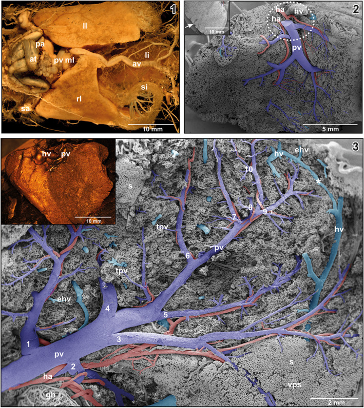 FIGURE 1. (1) Whole body vascular cast of adult X. laevis. Ventral view. Stereomicroscopic image. Note different size and shape of right (rl), middle (ml) and left lobe (ll) of the liver. (2) Microvascular anatomy of the liver of adult X. laevis. Vascular corrosion cast (VCC). Scanning electron micrograph. View at the viscero‐pleural surface. Encircled area marks the liver hilus where portal vein (pv) and hepatic artery (ha) approach and the hepatic vein (hv) leaves the liver parenchyma. Inset Serrated margin (arrow) of a right hepatic lobe. VCC. Scanning electron micrograph. (3) Right lobe of the liver of adult X. laevis. Intraparenchymal course and branching patterns of the hepatic portal vein. Ten branching generations (1–10) of the sub‐surface located portal vein are labelled. Superficial sinusoids of the viscero‐pleural surface are removed by microdissection. Note the marginal anastomosis (asterisk) between branches of the hepatic vein (hv). VCC. Scanning electron micrograph. Differentiation of portal venules (pv; blue) from hepatic venules (hv; blue/green) was by the presence of hepatic arterioles (ha) which flanked the former, but lacked in the latter. Inset Right lobe of liver. Viscero‐pleural aspect. VCC. Stereomicroscopic image