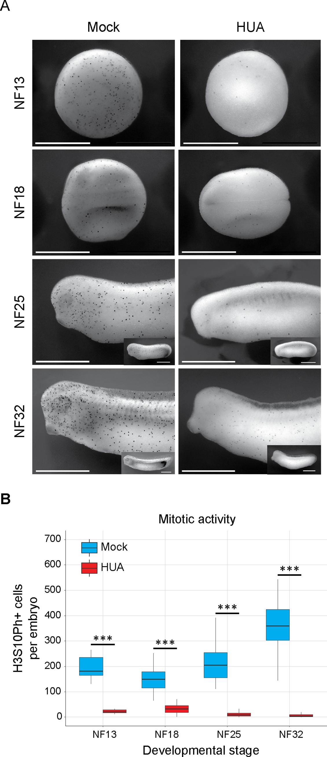 Fig 2. Continuous HUA treatment inhibits mitotic activity from gastrula to tadpole stages. (A) ICC for the mitotic histone mark H3S10Ph. Black dots represent mitotic cells. Elongated, older embryos are recorded as anterior halves, i.e., at the same magnification as younger stages, and in whole mount views as inserts. Scale bars: 1 mm. (B) Abundance of mitotic cells in Mock- and HUA-treated embryos. Box plots based on H3S10Ph-positive cells present on the recorded surface of embryos (n = 3 biological replicates/condition; Student t test [unpaired, two-tailed]; *** p < 0.001). The individual quantitative observations can be found in S1 Data. HUA, hydroxyurea and aphidicolin; ICC, immunocytochemical staining. https://doi.org/10.1371/journal.pbio.3001377.g002 |