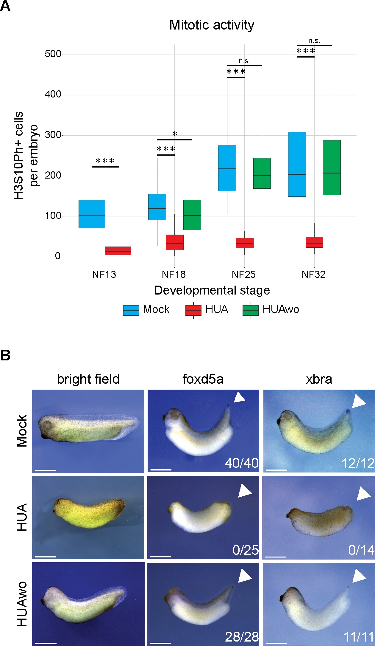 Fig 5. The HUA effects on embryogenesis are reversible. Embryos, which were transiently incubated in HUA solution and thus mitotically arrested, were returned to Mock solution at NF13. (A) Abundance of mitotic cells in Mock, HUA-treated, and HUAwo embryos. Box plots based on H3S10Ph-positive cells present on the recorded surface of embryos, displayed in S5 Fig (n ⥠3 biological replicates/condition; Student t test [unpaired, two-tailed]; *** p < 0.001; * p < 0.05; n.s., not significant). The individual quantitative observations can be found in S3 Data. (B) Morphological and molecular features of embryos at the early tadpole stage. In contrast to continuous HUA-treated embryos, HUAwo embryos regain eye cups, fin, and tailbud structures. In addition, they express foxd5a and xbra mRNAs in the growth zone of the tailbud, comparable to Mock embryos. Numbers indicate embryos positive for the marker over the total number of analyzed embryos (n = 3 biological replicates/condition). Scale bars: 1 mm. HUA, hydroxyurea and aphidicolin; HUAwo, HUA washout. https://doi.org/10.1371/journal.pbio.3001377.g005 |