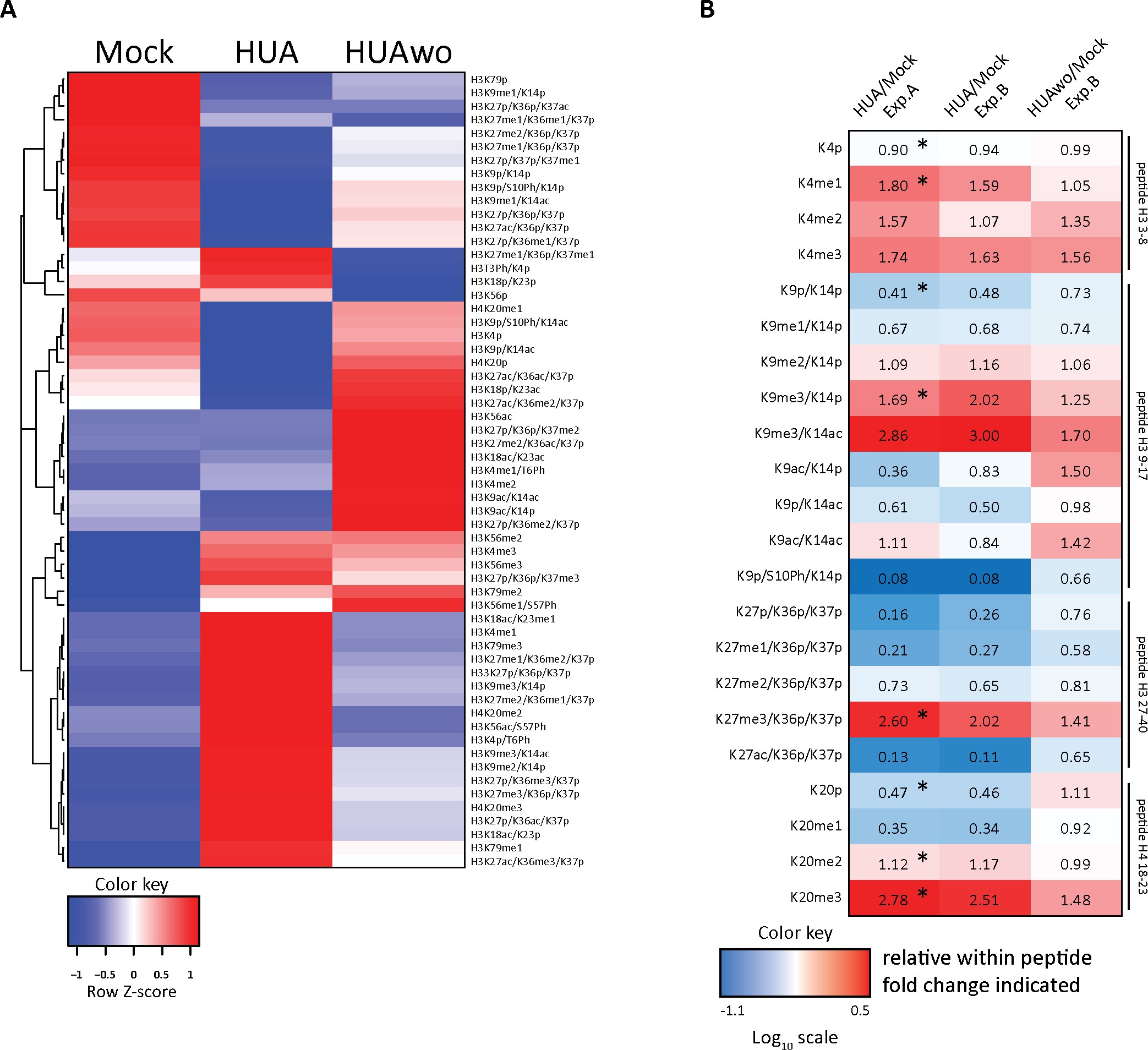 Fig 6. HUA effects on stage-specific HMPs are reversible. (A) Heatmap of the relative histone modification states abundance under the indicated conditions. As before, the relative distributions of the indicated modification states are calculated in percentages within each tryptic peptide. Data in columns are collected from early tadpole stage embryos NF32 (n = 1 biological replicate), independently from the data of experiment type A. Note: Relative differences between Mock and HUA samples of experiment type B are highly similar to the results of experiment type A (S6 Fig). Color key, row Z-score. The individual quantitative observations can be found in S4 Data. (B) Ratio heatmap of relative histone modification abundance for selected histone marks. First, the relative distributions of the indicated modification states are calculated as percentages within each tryptic peptide (S6 Fig). Then, the relative values are presented as ratios between sample pairs indicated on top, showing the relative change for each histone modification state between the 2 conditions. Color key is based on the Log10 scale. Numerical values in the cells indicate the fold-change. âp,â propionylated (naturally unmodified). Values greater than 1.0 indicate an increase in HUA condition; values smaller than 1.0 indicate a higher abundance in Mock condition. NA, not applicable, when values in Mock were 0. The first 2 columns illustrate the similarity between experiment types A and B; the information in the third column shows the similarity between HUAwo and Mock samples. Asterisks (*), adj.p < 0.1 (BenjaminiâHochberg procedure) between indicated conditions. The direct comparison of relative histone PTMs abundance is shown in S6 Fig. HMP, histone modification profile; HUA, hydroxyurea and aphidicolin; HUAwo, HUA washout. https://doi.org/10.1371/journal.pbio.3001377.g006 |