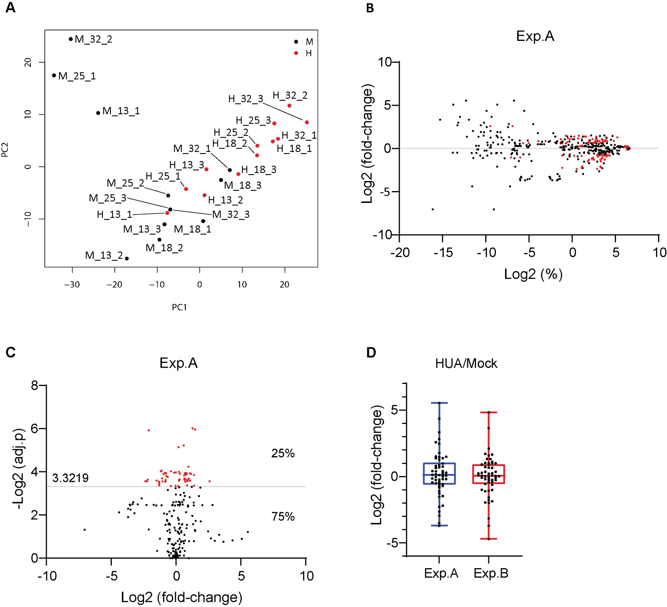 S3 Fig. Visualization of the data from experimental series A and B. (A) PCA for Mock- and HUA-treated HPMs (Exp. A). Each data point represents 64 modification states, measured by LCâMS/MS in PRM mode, with absolute abundance calculated with R10 spiketide normalization. Mock and HUA data sets are partially separated, with younger HUA samples intermingling with older Mock samples. (B) MA-plot detailing the distribution of Log2 transformed relative histone PTM abundance [Log2(%)] over Log2 transformed fold-change between HUA and Mock conditions [Log2(fold-change)] (Exp. A). Histone PTMs different between HUA and Mock conditions with adj.p < 0.1 (BenjaminiâHochberg procedure) highlighted in red. Lower abundant modifications tend to have larger variability. (C) Volcano plot shows the distribution of Log2 transformed fold-change [Log2(fold-change)] over negative Log2 transformed adj.p-value [âLog2(adj.p)] between HUA and Mock conditions (Exp. A). Baseline in gray: 3.3219 as âLog2(0.1). Histone PTMs different between HUA and Mock with adj.p < 0.1 (BenjaminiâHochberg procedure) are above the baseline, highlighted in red. One-quarter of the analyzed histone PTMs is significantly different between Mock and HUA conditions. (D) Boxplot indicates the distribution of Log2 transformed fold-changes [Log2(fold-change)] between HUA and Mock conditions in Exp. A and Exp. B. Median is shown. The results from Exp. A and Exp. B are similar. The direct comparison of relative abundance of the histone PTMs is shown in S6 Fig. The individual quantitative observations can be found in S6 Data. HPM, xxxx; HUA, hydroxyurea and aphidicolin; LCâMS/MS, liquid chromatographyâtandem mass spectrometry; PCA, principal component analysis; PRM, parallel reaction monitoring; PTM, posttranslational modification of histone. https://doi.org/10.1371/journal.pbio.3001377.s003 |