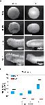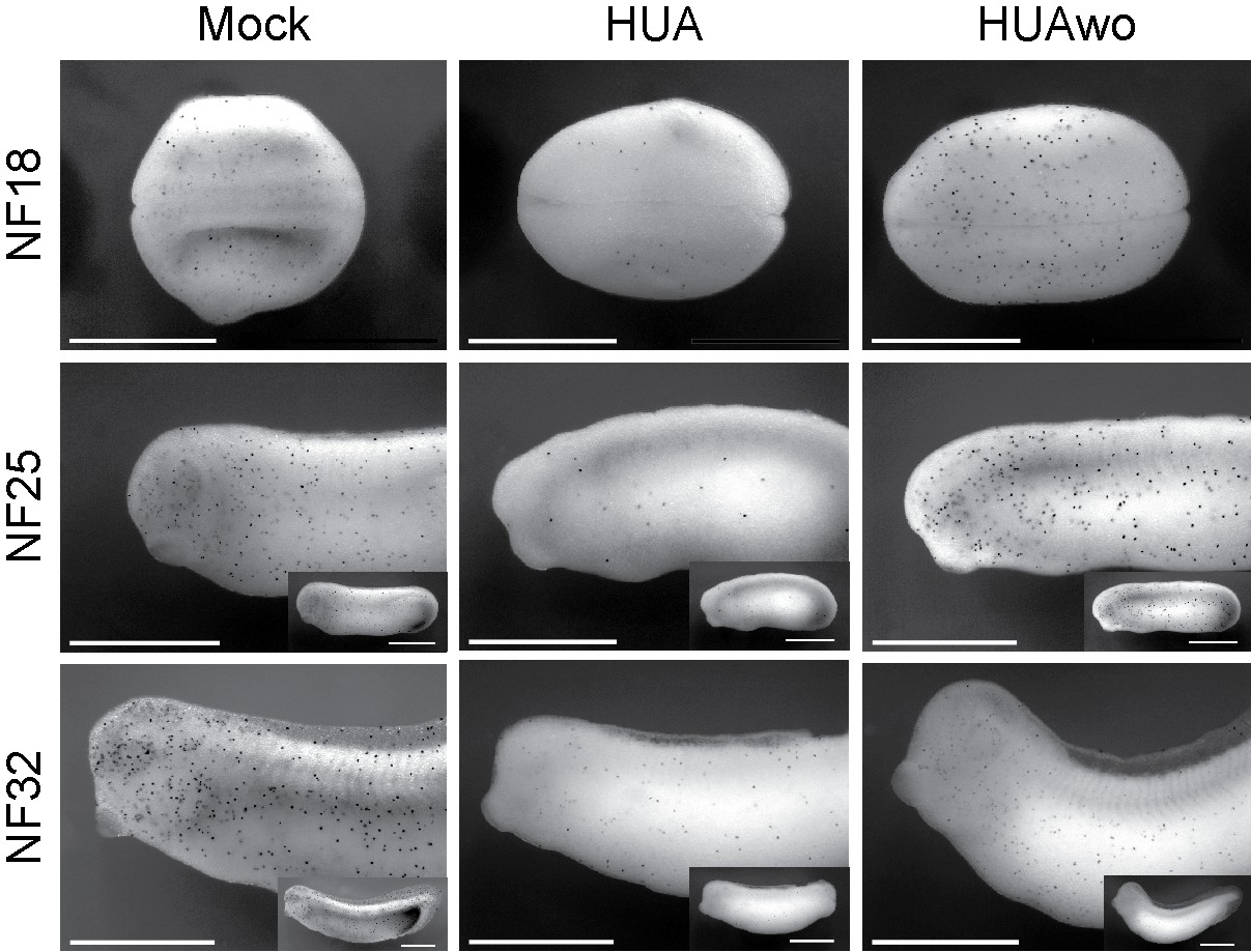 Fig 3. Morphological development of HUA-arrested embryos. (A) During gastrulation, Mock and HUA embryos are indistinguishable. At NF18, the latter show a delay in neural tube closure. More severe malformations are detectable at stages NF25 and NF32, most notably reduced eye formation and absence of tail bud. Scale bars: 1 mm. (B) Cell size at the tailbud stage. Flattened Z-stack images show fields from embryonic skin at constant magnification (scale bars: 20 μm). Immunofluorescence detects cell borders (beta-catenin), nuclei (DAPI), and mitotic cells (H3S10Ph). GIFs from Z-stacks are presented in the Supporting information (S1 and S2 Videos). (C) Whole mount RNA in situ hybridization for indicated marker genes. Images are representative for the majority of Mock- or HUA-treated embryos from 3 biological experiments. While mRNAs of α-tubulin and rx1 (skin, neuronal), α-globin, tnni3, actc1, and mhc-α (mesodermal) are detected in both conditions, xbra and foxd5a (tail blastema) are absent in HUA embryos. Numbers indicate embryos positive for the marker over the total number of analyzed embryos. Scale bars: 1 mm. HUA, hydroxyurea and aphidicolin. https://doi.org/10.1371/journal.pbio.3001377.g003 |