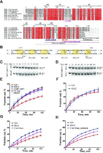 Figure 3. DNA terminus on H2A.Z nucleosome is accessible. (A) Sequence alignment of H2A and variant H2A.Z across species. The docking domain, L1 loop, extended acidic patch, M6-M7 cassette and C terminus are indicated. (B) 601 Windom sequence with the two restriction-enzyme cutting sites indicated. (C) Representative acrylamide gel of Hinf I DNA accessibility assay with the H2A.Z nucleosomes and canonical nucleosomes. (D) Representative acrylamide gel of the Nsil DNA accessibility assay with the H2A.Z nucleosome and canonical nucleosome. (E) Quantification of the HinfI DNA accessibility assay with canonical nucleosome (red), wild-type H2A.Z nucleosome (blue), and H2A.Z nucleosomes with L1 loop mutations (purple), with acidic patch mutations (pink), and with M6/7 cassette mutations (light blue). The graph shows the fraction of digested nucleosomes as a function of time. The data points are the average of different biological replicas. Data are mean ± SEM, n = 5. (F) Quantification of the Nsil DNA accessibility assay with canonical nucleosome and H2A.Z nucleosomes. Data are mean ± SEM, n = 3. (G) Quantification of the HinfI DNA accessibility assay with canonical nucleosome, wild-type H2A.Z nucleosome, and H2A.Z nucleosomes containing C_terminus mutant. Data are mean ± SEM, n = 6. H2A.Z C terminal mutant data shows statistically significant difference from H2A data (P = 0.0115) and H2A.Z data (P = 0.0027). (H) Quantification of the HinfI DNA accessibility assay with canonical nucleosome, wild-type H2A.Z nucleosome, and H2A.Z nucleosome with C_terminus_extended mutantations. Data are mean ± SEM, n = 6. H2A.Z nucleosome containing C_terminus_extended mutant data shows statistically significant difference from H2A data and H2A.Z data (P value for both < 0.0001).