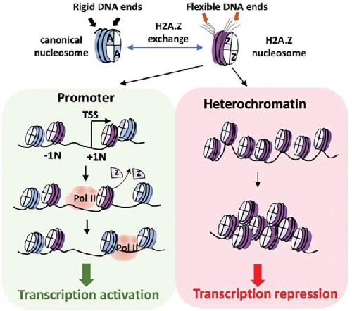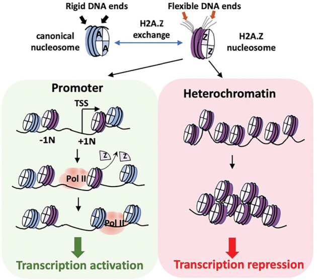 Figure 6. Model of H2A.Z-mediated transcription regulation. Incorporation of variant H2A.Z leads to a more labile nucleosome with flexible DNA termini. Flexible DNA terminus of the +1 H2A.Z nucleosome (+1N) preceding the transcription start site (TSS) lower the activation energy for RNA Polymerase II (Pol II) during transcription initiation. The less rigid DNA terminus on a poly-nucleosome containing H2A.Z also enables the formation of a more compact and repressive chromatin domain.