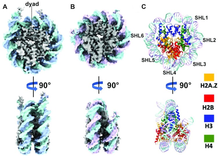 Figure 1. Cryo-EM structures reveal flexible DNA terminus in H2A.Z nucleosomes. (A) Cryo-EM density map of the canonical nucleosomes at 3.8 Å resolution: disc view (top) and side view (bottom). (B) Cryo-EM map of H2A.Z nucleosome at 3.7 Å resolution: disc view (top) and side view (bottom). (C) Atomic model of H2A.Z nucleosome: disc view (top) and side view (bottom).