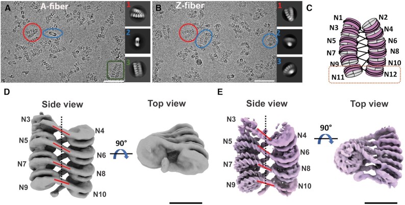 Figure 4. Cryo-EM structures of chromatin fibers containing H2A.Z and H2A nucleosomes. (A) Representative micrographs of vitreous sample of H2A fiber with selected 2D classes. Particles that share the same view as the 2D classes are color coded the same way and highlighted with either a circle or a square. Scale bar = 25 nm. (B) Representative micrographs of vitreous sample of H2A.Z fiber with selected 2D classes. Scale bar = 25 nm. (C) Schematic of dodeca-nucleosome fiber. A di-nucleosome structural unit is highlighted in an orange square. (D) cryo-EM map of multi-body refined H2A fiber, side and top view; Nucleosome 3 to 10 are shown. Linker DNAs are highlighted with red lines and the fiber axis is shown as a dotted line. Scale bar = 10 nm. Resolution of individual nucleosome ranged from 10 to 14.8 Å. (E) cryo-EM map of multi-body refined H2A.Z fiber, side and top view. Scale bar = 10 nm. Resolution of individual nucleosome ranged from 7.5 to 12.5 Å.