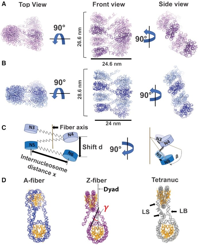 Figure 5. Chromatin fiber containing H2A.Z is more compact (A) pseudo-atomic models of z-fiber containing nucleosome N3–N10, top view, front view and the side view. In side view, only one fiber strand is shown. (B) pseudo-atomic models of c-fiber; containing nucleosome N3- N10, top view, front view and the side view. In side view, only one fiber strand is shown. (C) Schematic of the chromatin model to depict inter-nucleosome distance x, shift d and rotation β between two adjacent di-nucleosome units as mentioned in the text. (D) comparison of di-nucleosome from three chromatin fiber models. DNA exit angle γ is shown. LS denotes the straight linker DNA and LB denotes the bend linker DNA in the tetra-nucleosome crystal structure (PDB ID: 1ZBB).