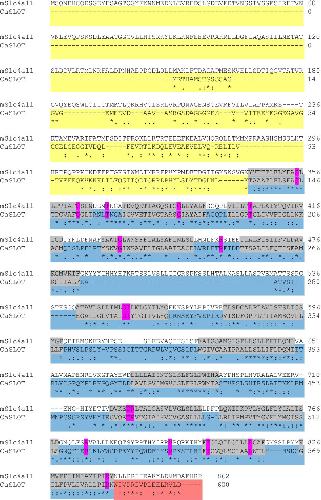 Fig. 2. Protein sequence alignment of mouse Slc4a11 and Chara australis CaSLOT. Alignment performed by Clustal Omega (https://www.ebi.ac.uk/Tools/msa/clustalo/) and manually refined. Colours represent the three major structural domains: cytosolic amino-terminal domain (yellow), membrane-spanning domain (blue, with individual membrane spans in grey), and cytosolic carboxy-terminal domain (red). Conserved residues mutated in disease in human SLC4A11 (Alka and Casey 2018) are shown in pink