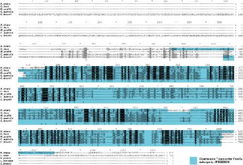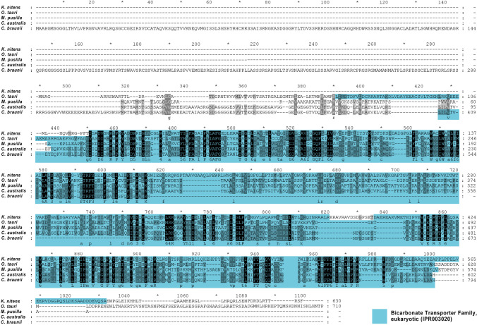 Fig. 3. Protein sequence alignment of homologous forms of CaSLOT proteins of various green algae. Bicarbonate transporter family domains (IPR003020) are marked according to InterPro analyses (https://www.ebi.ac.uk/) and denote sequence homology to bicarbonate transporters of the SLC4 protein family rather than demonstrated functionality. Sequences used in the alignment: Chara australis SLOT (CaSLOT, GenBank: MN103545); Chara braunii, hypothetical protein CBR_g23541 (GenBank: GBG77214.1); Klebsormidium nitens (GenBank: GAQ87198.1); Ostreococcus tauri, HCO3− transporter family-domain-containing protein (GenBank: OUS47809.1); Micromonas pusilla (XP_003055831.1)