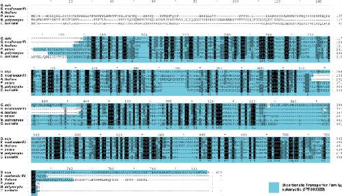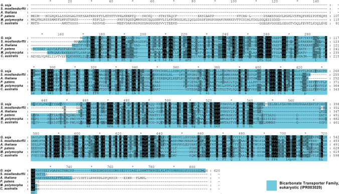 Fig. 4. Protein sequence alignment of homologous forms of CaSLOT proteins of various land plants. Bicarbonate transporter family domains (IPR003020) are marked according to InterPro analyses (https://www.ebi.ac.uk/) and denote sequence homology to bicarbonate transporters of the SLC4 family rather than functionality. Sequences used in the alignment: Arabidopsis thaliana (GenBank: AAD26598.1); Glycine soja (GenBank: KHN06659.1); Selaginella moellendorffii, hypothetical protein (GenBank: EFJ22813.1); Physcomitrella patens, anion exchange protein 4-like isoform X1 (XP_024395568.1); Marchantia polymorpha, hypothetical protein (GenBank: PTQ38262.1); and Chara australis SLOT (CaSLOT, GenBank: MN103545)