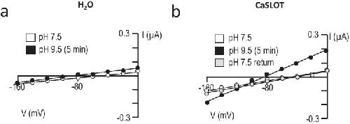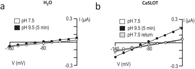 Fig. 5. Representative I-V plots gathered from H2O-injected and CaSLOT-expressing oocytes. a H2O-injected cell and b CaSLOT-cRNA-injected cell. The white data points show the initial relationship between current and voltage with the cells in pH 7.5 bath solution. The black data points show the relationship between current and voltage of the cell membrane after 5 min of exposure to pH 9.5 bath solution. The grey data points in panel b show that the change in the relationship between current and voltage in CaSLOT-expressing cells in response to increased extracellular pH is reversible upon return to pH 7.5 bath solution