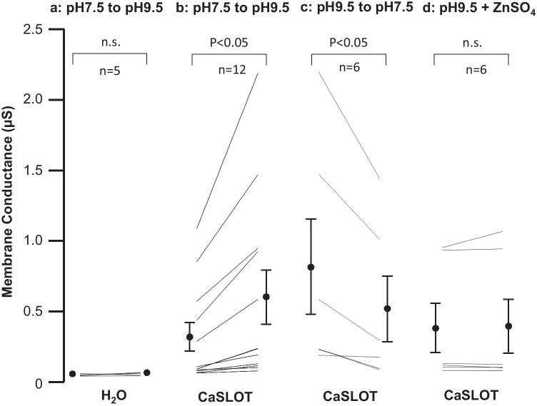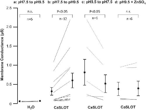 Fig. 6. Comparison of conductance values gathered from water-injected controls and CaSLOT-expressing oocytes. The first column (a) shows the response of H2O-injected cells as the bath solution switches from pH 7.5 to pH 9.5. The second column (b) shows changes in conductance of CaSLOT-expressing cells under the same conditions. The third column (c) shows the effect on a subset of the cells from column (b), of restoring bath pH to 7.5. The fourth column (d) shows how the conductance of a subset of the CaSLOT-expressing cells from column (b) responds to a 5 min exposure to 1 mM ZnSO4. Statistics are the result of paired t-tests