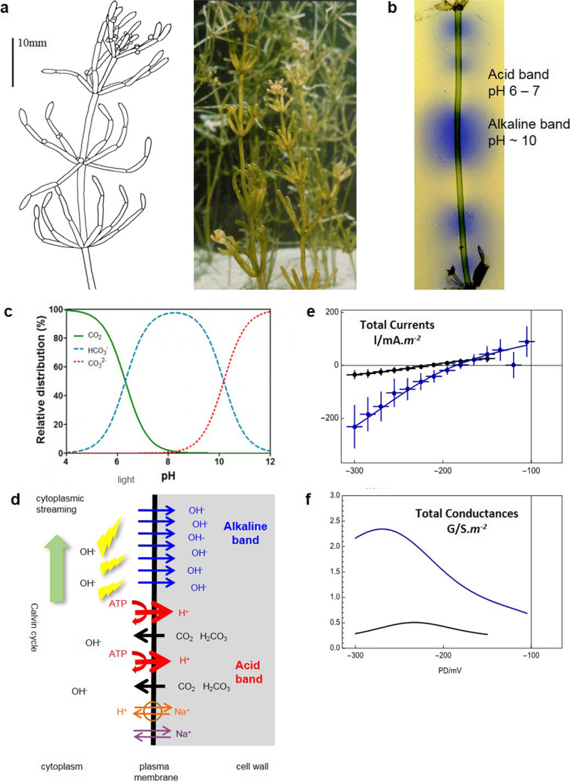 Chara australis plant (Beilby and Casanova 2014). b Internodal Chara cell in the light shows the banding pattern in pH indicator Bromothymol Blue. c DIC (dissolved inorganic carbon) speciation in water (Pedersen et al. 2013). d The transporters involved in the banding pattern and the OH− transporter response in saline media (Absolonova et al. 2018). In the alkaline band: OH− transporters (blue). In the acid band: H+ ATPase AHA (red), Na+/H+ antiporter NHX (orange), non-selective cation channel HKT (violet), which is thought to let Na+ into the cell in saline media (see Phipps et al. 2021, for characterization of the transporters). CO2 and H2CO3 (black) permeate through the lipid bilayer. For further details see text. The contrast of the e I/V and f G/V characteristics of the proton pump dominated state (black, pH 7.1, statistics: 12 I/V profiles from 5 cells) and OH− transpoter dominated state (blue, pH 11.1, statistics: 12 I/V profiles from the same 5 cells). The data were fitted (lines) by Gradmann-Sanders-Slayman model for the proton pump and E-GHK model for the OH− transporter (see Beilby and Bisson 2012 for model parameters)