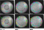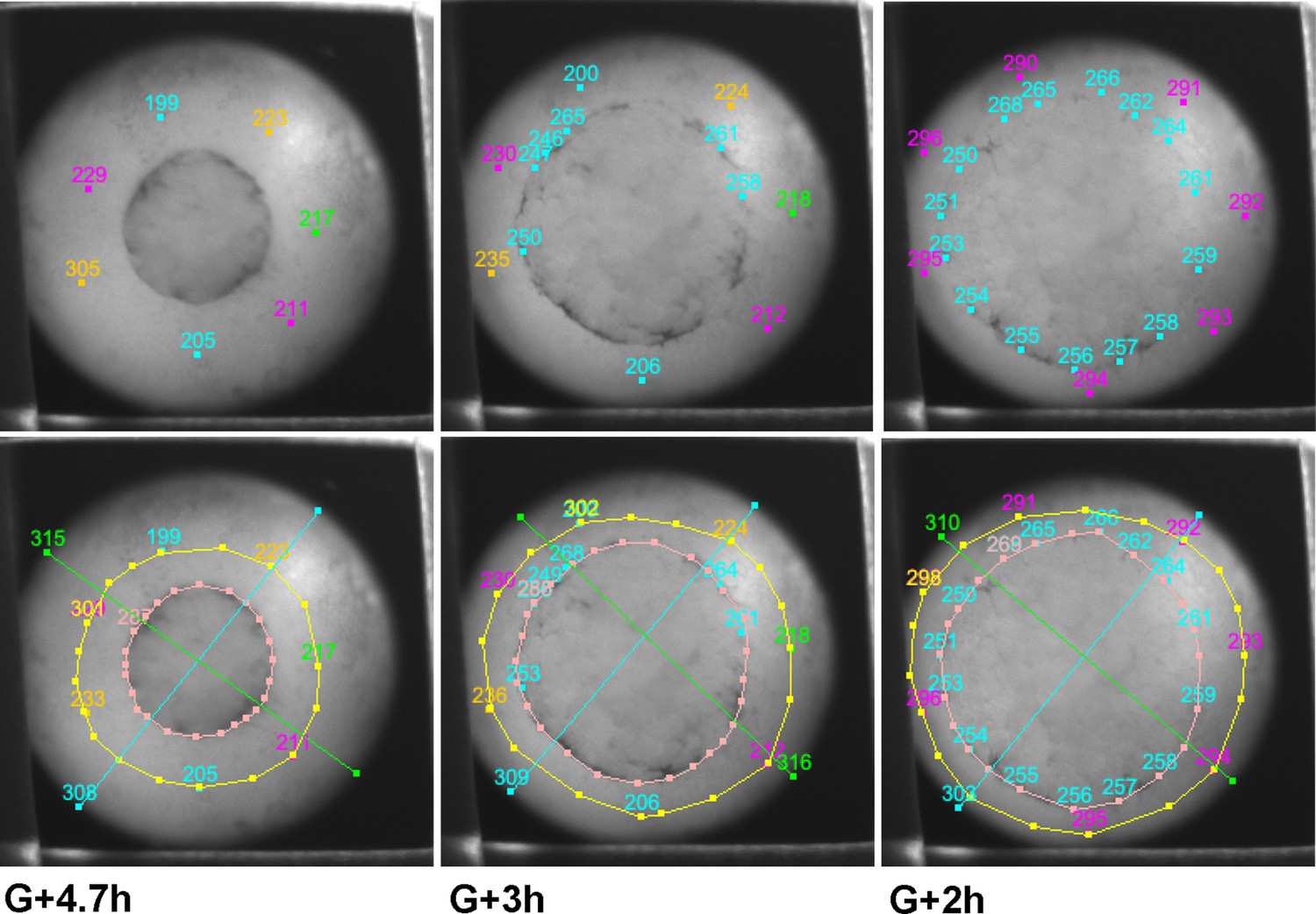 Figure 6—figure supplement 2. Examples of tracking of IMZ and blastopore area through the course of a time lapse movie using fiduciary points.Points initially laying at the blastopore lip at late time points (~G + 8 h) are tracked backward to early gastrula stages (top row, outer points). Once bottle cells apices are revealed, the vegetal edge of the bottle field is also tracked backwards (top row, inner circle of blue points). At each time point, the blastoporal area (or prospective blastoporal area, at earlier stages) is determined (area inside pink line), as is the area inside the upper boundary of the IMZ (yellow line – a bit below the actual limit of involution). Areas are determined based on the spherical area of the embryo occupied by each region (see Materials and methods). IMZ area is determined as the area inside the upper IMZ boundary minus the blastoporal area ( = area inside the lower IMZ boundary). Areas are normalized to starting area for each embryo. The embryo shown is a ventralized embryo. |
