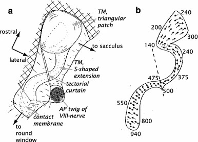 Schematic drawing of the amphibian papilla of the bullfrog, Rana catesbeiana, (adapted from Lewis et al. 1982), rotated to match orientation of Fig. 1). TM Tectorial membrane, AP amphibian papilla. a General overview of the AP; the dashed outline indicates the location of the sensory epithelium, b hair cell orientation in the sensory epithelium; dashed line indicates the position of the tectorial curtain. The numbers along the perimeter indicate the characteristic frequency of the auditory nerve fibers connecting to that site (in Hz)