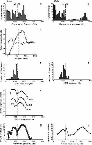 Overview of measurements of the frog inner ear; comparison between Rana (left) and Hyla (right). The dashed lines indicate the separation between the amphibian papilla and the basilar papilla. a, b Distributions of characteristic frequencies of auditory nerve fibers in Rana pipiens pipiens, and Hyla cinerea. c Example of the response of the contact membrane in R. catesbeiana; black line represents the amphibian papilla, open markers the basilar papilla. d, e Distributions of spontaneous otoacoustic emissions in ranid species (combined data from R. pipiens pipiens and R. esculenta), and hylid species (combined data from H. cinerea, H. chrysoscelis, and H. versicolor). f Example of stimulus frequency otoacoustic emissions in R. pipiens pipiens at indicated stimulus levels. g, h Examples of DP-grams measured in Rana pipiens pipiens, and Hyla cinerea. a, b, d, e, g and h are taken from Van Dijk and Meenderink (2006). There they were reproduced from Ronken (1990), Capranica and Moffat (1983), Van Dijk et al. (1989, 1996), Meenderink and Van Dijk (2004), and Van Dijk and Manley (2001), respectively. c is taken from Purgue and Narins (2000a), and f is an adapted presentation of data from Meenderink and Narins (2006) (graph created with data provided by Dr. Meenderink)