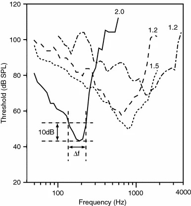 Tuning curves measured in the auditory nerve in R. catesbeiana (unpublished measurements by JMS & PvD, 1992; various specimens). The numbers in the graph indicate 𝑄10dB