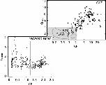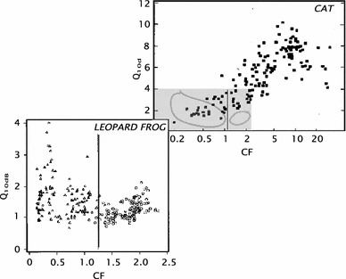 versus the characteristic frequency (CF, in kHz) of nerve fibers from the cat cochlea (adapted from Evans 1975) and the leopard frog (adapted from Ronken 1991). In the leopard frog graph, the triangular symbols correspond to nerve fibers from the amphibian papilla; the circles to fibers from the basilar papilla. The black line indicates the upper limit of the amphibian papilla’s frequency domain. The grey area in the upper (cat) graph corresponds to the area of the lower (frog) graph. The loops indicate the approximate perimeter of the fiber populations in the lower graph for the amphibian papilla and the basilar papilla.