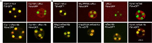(A) Representative nucleoli from oocytes expressing Gar1 and Gar1M1 nucleolar localization and the same proteins fused with a GFP nanobody (Nb). These proteins were all fused with a red fluorescent protein and were co-expressed with Fbl-eGFP, a DFC marker. (B) Nhp2 and Nhp2P83A with and without nanobody fusion co-expressed with Fbl-eGFP. (C) The localization of a monomeric fluorescent protein (mRed) and Npm1 bound to the GFP nanobody, co-expressed with Fbl-eGFP. For each condition in Fig 3, 35+ nucleoli were observed from each of 3 different injection days, representative images are shown here. Scale: 20 μm. DFC, dense fibrillar component.