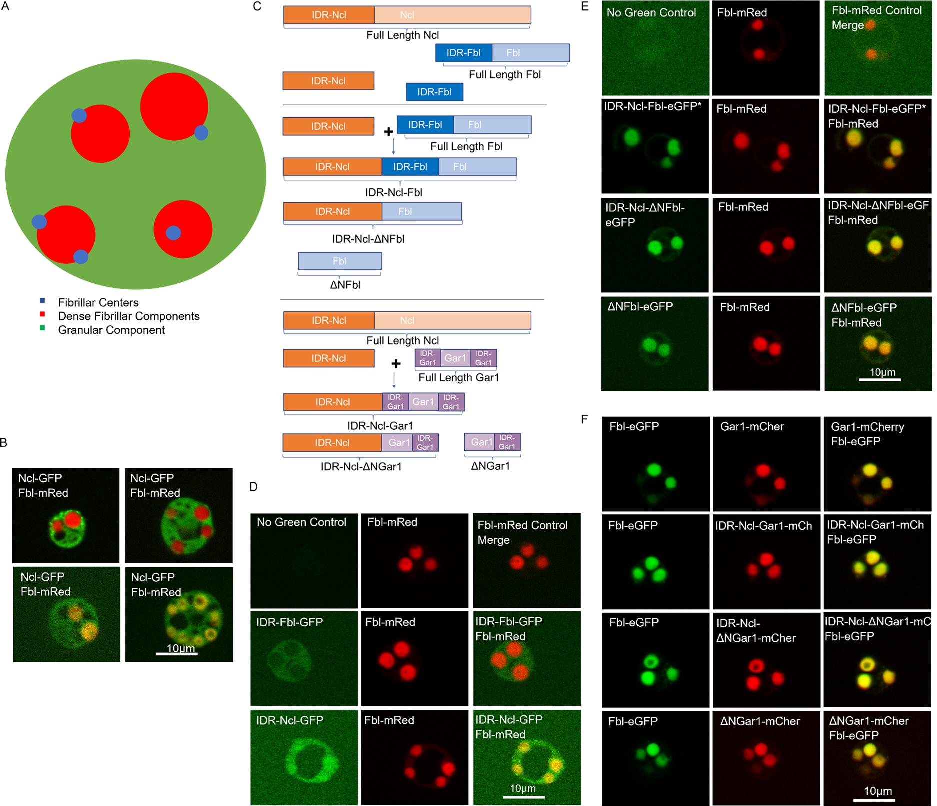 (A) Model of the 3 nucleolar subdomains or compartments. (B) Biological variation of wild-type Ncl-GFP co-expressed with Fbl-mRed, shown as expressed in four different frogs, showing that Ncl is always in the GC and sometimes spreads into the DFC. (C) Schematic of the protein fusions shown in D-F. Each of these fusions also contains a green or red fluorescent protein as indicated in B that allowed detection. The IDR-Ncl has a net negative charge of −40, the IDR-Fbl has a net positive charge of +17, and the N terminal IDR-Gar1 has a net positive charge of +7. (D–F) Representative images of nucleoli with IDR chimera proteins fused with a fluorescent protein co-expressed with a DFC nucleolar domain marker (Fbl). (D) Representative images showing the intrinsically disordered regions of Fbl (IDR-Fbl-GFP) and Ncl (IDR-Ncl-GFP) co-expressed with Fbl-mRed. (E) Representative images showing the fusions of IDR-Ncl and Fbl, showing IDR-Ncl-Fbl-eGFP, IDR-Ncl-ΔNFbl-eGFP, and ΔNFbl-eGFP all co-expressed with Fbl-mRed. *IDR-Ncl-Fbl-eGFP images were taken at a lower exposure in the green channel due to it being far brighter than the other constructs in this set. (F) Representative images showing the fusions of IDR-Ncl and Gar1, showing the localization of Gar1-mCherry (WT that localizes to the DFC), IDR-Ncl-Gar1-mCherry, IDR-Ncl-ΔNGar1-mCherry, and ΔNGar1-mCherry all co-expressed with Fbl-eGFP. Scale 10 μm. Statistical analysis is shown in S1 Fig and S2 Data. DFC, dense fibrillar component; IDR, intrinsically disordered region.