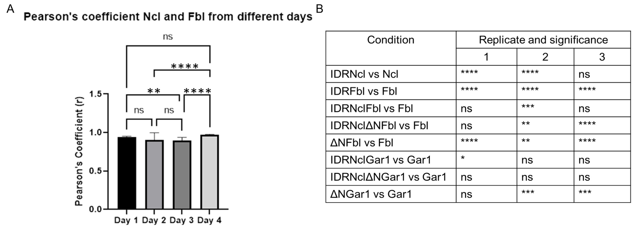 (A) Statistical analysis using Pearson’s Coefficient to assess the overlap of fluorescently tagged Ncl co-expressed with fluorescently tagged Fbl on 4 different days using one-way ANOVA multiple comparisons test, p < 0.05. N = 15, 58, 52, and 24 for days 1–4 respectively. (B) Table showing the results of the statistical analysis comparing the coefficients of variations of the conditions indicated in the left column. Replicates “1, 2, and 3” indicate different frogs/injection days for each condition. Values from columns are not necessarily from the same day (data should be read horizontally and not vertically). P < 0.05, N values between 15–62. The underlying data can be found in S2 Data.