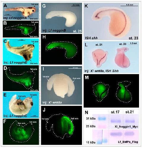 Figure 1. Induction of secondary body axes upon injection of nogginA, nogginB, nogginC and wnt8a mRNAs in X. laevis and L. fluviatilis embryos. (A–F) Injections of lamprey nogginA, nogginB and nogginC mRNAs induce secondary axes in X. laevis. (G,H) Injections of lamprey nogginB mRNA do not induce secondary axes in L. fluviatilis embryos. (I,J) Injections of amphibian wnt8a mRNA induce secondary axes in L. fluviatilis embryos. (K) sonic hedgehog (shh) expression in L. fluviatilis embryos detected by ISH in an uninjected control embryo. (L,M) Detection of secondary axes in L. fluviatilis embryos by sonic hedgehog (shh) ISH. (N) Proteins, translated from injected Xl_noggin1-Myc and Lf_BMPa-Flag mRNAs, are detected in lamprey embryos at stages 17 and 21.