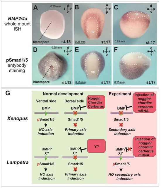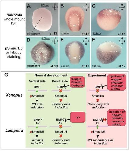 Figure 2. Hypothetical difference in the mechanism of BMP signaling between lamprey and amphibians. BMP2/4a expression by ISH (A–C) and antibody staining of Smad1/5 phosphorylation (D–F) in L. fluviatilis embryos. np—neural plate. (G) Smad1/5 phosphorylation might be modulated by factor(s) other than BMP, as injections of BMP inhibitors do not induce secondary axes in lamprey.