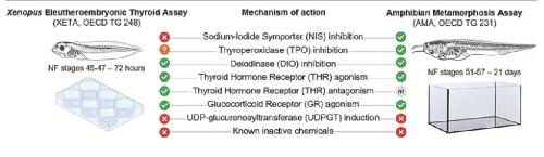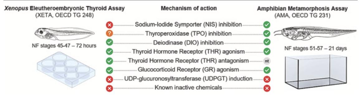 The Xenopus Eleutheroembryonic Thyroid Assay (XETA) was recently published as an OECD Test Guideline for detecting chemicals acting on the thyroid axis. However, the OECD validation did not cover all mechanisms that can potentially be detected by the XETA. This study was therefore initiated to investigate and consolidate the applicability domain of the XETA regarding the following mechanisms: thyroid hormone receptor (THR) agonism, sodium-iodide symporter (NIS) inhibition, thyroperoxidase (TPO) inhibition, deiodinase (DIO) inhibition, glucocorticoid receptor (GR) agonism, and uridine 5'-diphospho-glucuronosyltransferase (UDPGT) induction. In total, 22 chemicals identified as thyroid-active or -inactive in Amphibian Metamorphosis Assays (AMAs) were tested using the XETA OECD Test Guideline. The comparison showed that both assays are highly concordant in identifying chemicals with mechanisms of action related to THR agonism, DIO inhibition, and GR agonism. They also consistently identified the UDPGT inducers as thyroid inactive. NIS inhibition, investigated using sodium perchlorate, was not detected in the XETA. TPO inhibition requires further mechanistic investigations as the reference chemicals tested resulted in opposing response directions in the XETA and AMA. This study contributes refining the applicability domain of the XETA, thereby helping to clarify the conditions where it can be used as an ethical alternative to the AMA.