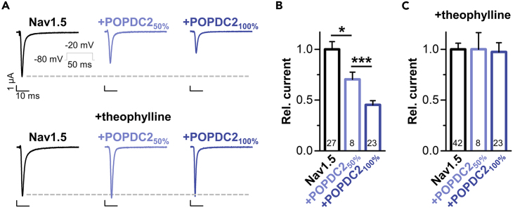 Popeye domain containing (POPDC) proteins are predominantly expressed in the heart and skeletal muscle, modulating the K2P potassium channel TREK-1 in a cAMP-dependent manner. POPDC1 and POPDC2 variants cause cardiac conduction disorders with or without muscular dystrophy. Searching for POPDC2-modulated ion channels using a functional co-expression screen in Xenopus oocytes, we found POPDC proteins to modulate the cardiac sodium channel Nav1.5. POPDC proteins downregulate Nav1.5 currents in a cAMP-dependent manner by reducing the surface expression of the channel. POPDC2 and Nav1.5 are both expressed in different regions of the murine heart and consistently POPDC2 co-immunoprecipitates with Nav1.5 from native cardiac tissue. Strikingly, the knock-down of popdc2 in embryonic zebrafish caused an increased upstroke velocity and overshoot of cardiac action potentials. The POPDC modulation of Nav1.5 provides a new mechanism to regulate cardiac sodium channel densities under sympathetic stimulation, which is likely to have a functional impact on cardiac physiology and inherited arrhythmias.