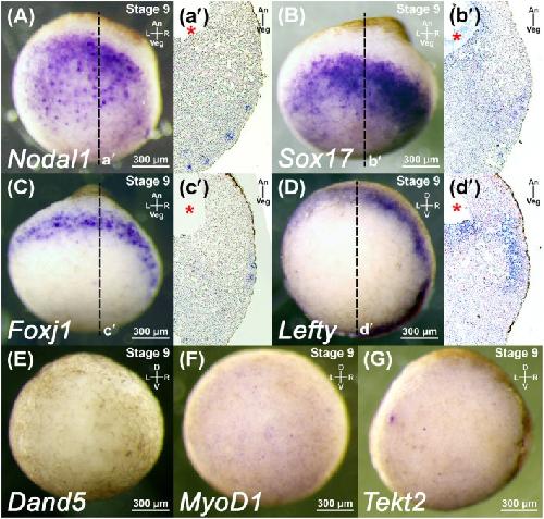 FIGURE 1. Molecular patterning of late blastula (stage 9). (A, a′) Nodal1 expression in the vegetal hemisphere. (B, b′) Sox17 expression in the vegetal hemisphere. (C, c′) Foxj1 expression in the superficial mesoderm. (D, d′) Lefty expression in the deep mesoderm. (E–G) Dand5, MyoD1 and Tekt2 expression is still undetectable. An, animal pole; D, dorsal, L, left; R, right; V, ventral; Veg, vegetal pole. Whole‐mount blastulae (A–G) are viewed from dorso‐vegetal side, transverse sections through dorsal side (a′–d′) are sagittal. Asterisks indicate the blastocoel.