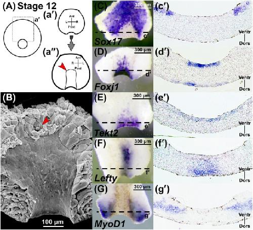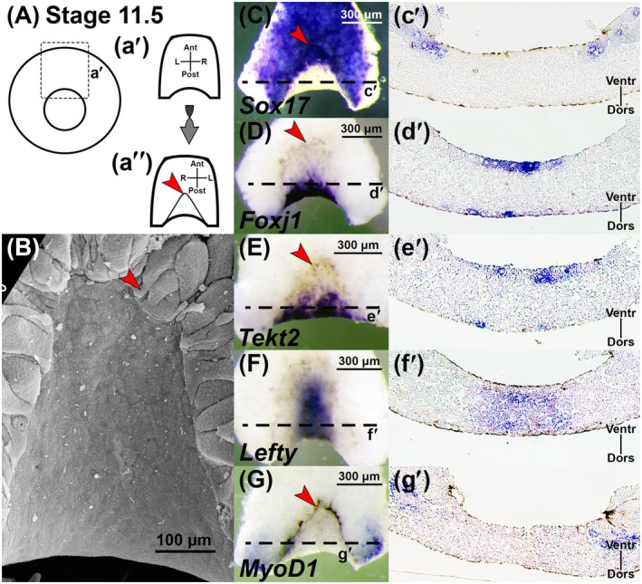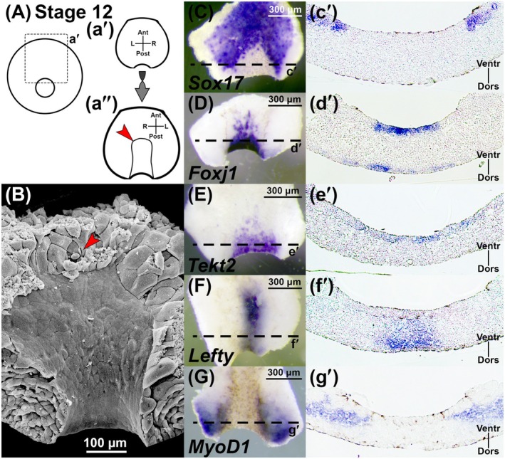 FIGURE 6. Molecular patterning of late gastrula (stage 12). (A) Scheme of whole‐mount embryo, dorsal side up. (a′) Scheme of dorsal explant, dorsal side up. (a″) Scheme of dorsal explant, ventral side up. (B) Scanning electron microscopy image of emerging archenteron roof. (C, c′) Sox17 expression in the yolk cells and the endoderm marking the marginal zone of archenteron. (D, d′) Foxj1 expression in the superficial mesoderm undergoing involution. (E, e′) Tekt2 expression in the superficial mesoderm undergoing involution. (F, f′) Lefty expression in the deep axial mesoderm. (G, g′) MyoD1 expression in the deep paraxial mesoderm. Ant, anterior; Dors, dorsal, L, left; Post, posterior; R, right; Ventr, ventral. Dorsal explants (B–G) are viewed from ventral side, transverse sections through dorsal blastopore lip are cross (c′–g′). Arrowheads indicate bottle cells forming the front margin of achenteron.