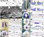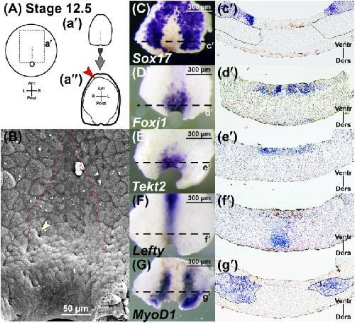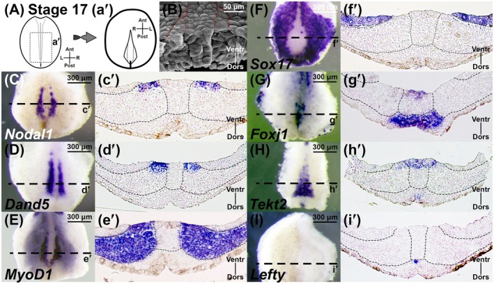 FIGURE 12. Molecular patterning at late neurula (stage 17). (A) Scheme of whole‐mount embryo, dorsal side up. (a′) Scheme of dorsal explant, ventral side up. (B) Scanning electron microscopy image of GRP. (C, c′) Nodal1 expression in the lateral cells of GRP. (D, d′) Dand5 expression in the lateral cells of GRP. (E, e′) MyoD1 expression in the deep paraxial mesoderm and in the lateral cells of GRP. (F, f′) Sox17 expression in endoderm. (G, g′) Foxj1 expression marks the medial part of GRP, the neural plate and several cells in the ectoderm. (H, h′) Tekt2 expression marks the GRP, the neural plate and several cells in the ectoderm. (I, i′) Lefty expression in the neural floor plate. Ant, anterior; Dors, dorsal, L, left; Post, posterior; R, right; Ventr, ventral. Dorsal explants (C–I) are viewed from ventral side, transverse sections through the explants are cross (B, c′–i′). Dot lines indicate cell separation.