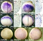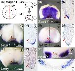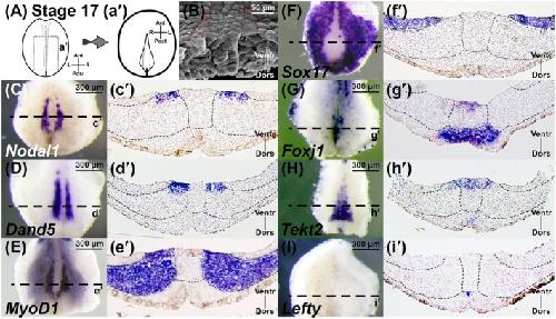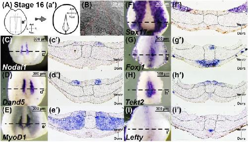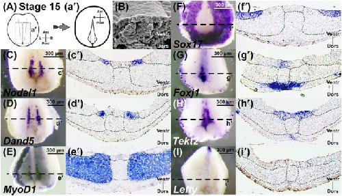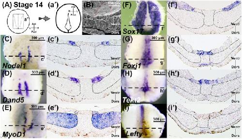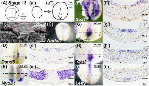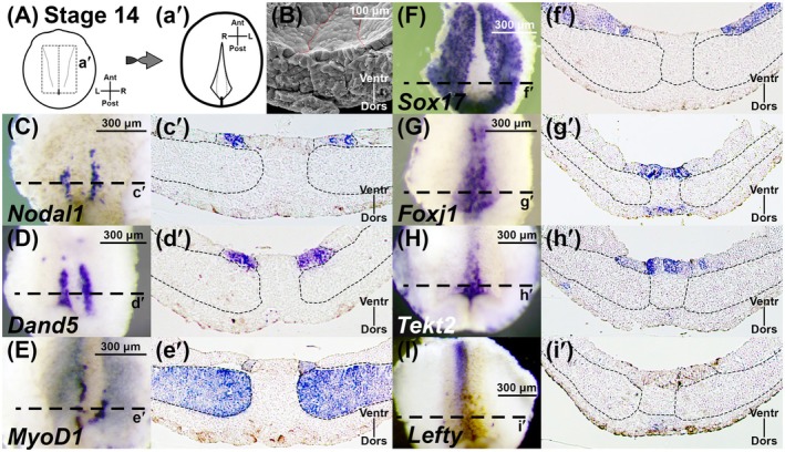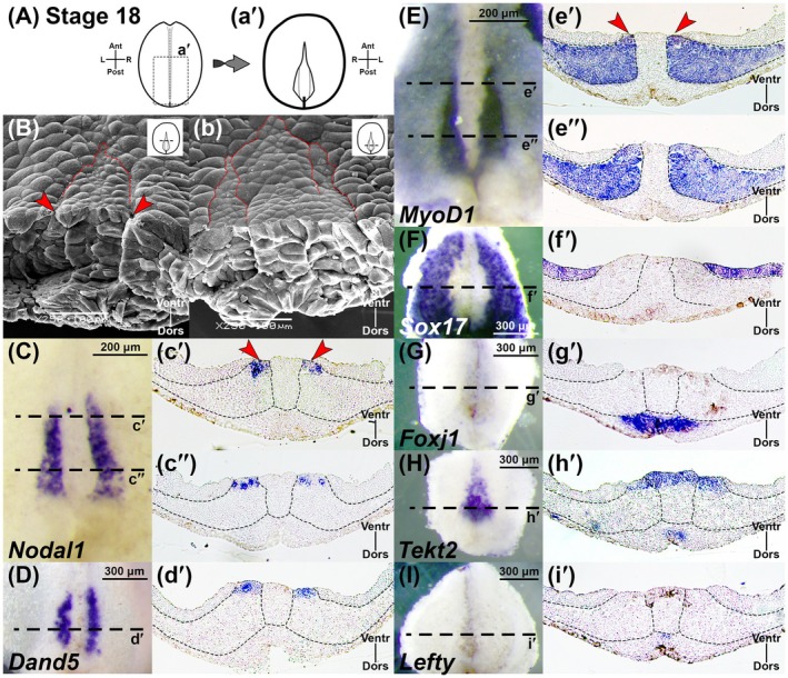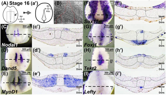 FIGURE 9. Molecular patterning at early neurula (stage 14). Specification of lateral cells in the GRP. (A) Scheme of whole‐mount embryo, dorsal side up. (a′) Scheme of dorsal explant, ventral side up. (B) Scanning electron microscopy image of GRP. (C, c′) Nodal1 expression emerges in the lateral cells of GRP. (D, d′) Dand5 expression in the lateral cells of GRP. (E, e′) MyoD1 expression marks the deep paraxial mesoderm and emerges in the lateral cells of GRP. (F, f′) Sox17 expression in the endoderm. (G, g′) Foxj1 expression marks the GRP in the archenteron roof and the neural plate. (H, h′) Tekt2 expression marks the GRP in the archenteron roof. (I, i′) Lefty expression in the neural floor plate. Ant, anterior; Dors, dorsal, L, left; Post, posterior; R, right; Ventr, ventral. Dorsal explants (C–I) are viewed from ventral side, transverse sections through the explants are cross (B, c′–i′). Dot lines indicate cell separation.