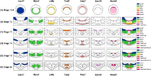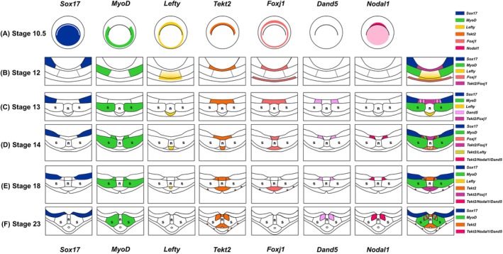 FIGURE 15. Expression pattern scheme of the studied genes at successive stages of Xenopus development. (A) Scheme of expression patterns at early gastrula (stage 10.5). Nodal1 and Sox17 are coexpressed in the vegetal hemisphere, bottle cells and suprablastoporal endoderm. Lefty expression is located in the deep axial mesoderm, and MyoD1 expression in the deep paraxial mesoderm. Foxj1 and Tekt2 are coexpressed in the superficial mesoderm. (B) Scheme of expression patterns at late gastrula (stage 12). Sox17 is expressed in the endoderm around the emerging left–right organizer. Lefty expression is in the deep axial mesoderm, and MyoD1 expression in the deep paraxial mesoderm. Foxj1 and Tekt2 expression areas in the superficial mesoderm have undergone involution and are positioned at the ventral side of the gastrocoel roof. Nodal1 expression in the vegetal hemisphere has faded. (C) Scheme of expression patterns at the beginning of neurulation (stage 13). Sox17 is expressed in the endoderm around the emerging left–right organizer. Lefty expression is in the deep axial mesoderm, and MyoD1 expression in the deep paraxial mesoderm. Foxj1 and Tekt2 expression marks the GRP in the archenteron roof, with additional expression of Foxj1 in the neural plate. Dand5 expression emerges in the lateral cells of GRP. (D) Scheme of expression patterns at early neurula (stage 14). Sox17 is expressed in the endoderm, and Lefty is expressed in the neural floor plate. MyoD1 expression marks the deep paraxial mesoderm and emerges in the lateral cells of GRP. Foxj1 expression marks the GRP in the archenteron roof and the neural plate, and Tekt2 expression marks the GRP in the archenteron roof. Dand5 is expressed in the lateral cells of GRP, and Nodal1 starts to be coexpressed with Dand5. (E) Scheme of expression patterns at late neurula (stage 18). Sox17 is expressed in the endoderm, and Lefty is expressed in the neural floor plate. MyoD1 expression is located in the deep paraxial mesoderm and in the lateral cells of GRP. Foxj1 expression disappears from the medial part of GRP and marks the neural plate and several cells in the ectoderm. Tekt2 expression marks the GRP, the neural plate and several cells in the ectoderm. Nodal1 and Dand5 are coxpressed in the lateral cells of GRP. (F) Scheme of expression patterns at tailbud stage (stage 23). The endoderm marked by Sox17 is covering the GRP. MyoD1 is expressed in the deep paraxial mesoderm and in the lateral cells of GRP. Nodal1 and Dand5 are coexpressed in the lateral cells of GRP which are gradually covered by endoderm layer. Tekt2 expression marks the GRP, the neural plate and several cells in the ectoderm. n, notochord; s, presumptive somitic mesoderm.
