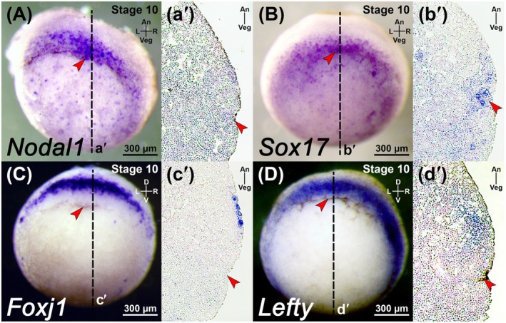 FIGURE 2. Molecular patterning at the beginning of gastrulation (stage 10). (A, a′) Nodal1 expression in the vegetal hemisphere, bottle cells and suprablastoporal endoderm. (B, b′) Sox17 expression in the vegetal hemisphere, bottle cells and suprablastoporal endoderm. (C, c′) Foxj1 expression in the superficial mesoderm. (D, d′) Lefty expression in the deep mesoderm. An, animal pole; D, dorsal, L, left; R, right; V, ventral; Veg, vegetal pole. Whole‐mount gastrulae (A–D) are viewed from dorso‐vegetal side, transverse sections through dorsal blastopore lip (a′–d′) are sagittal. Arrowheads indicate forming archenteron marked by bottle cells.