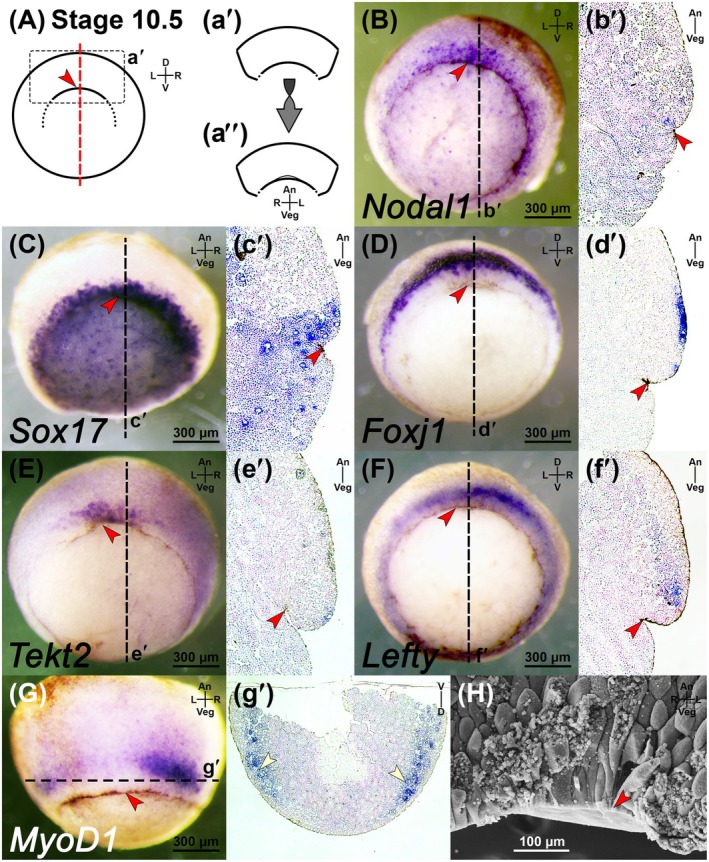 FIGURE 3. Molecular patterning of early gastrula (stage 10.5). (A) Scheme of whole‐mount embryo, dorsal side up. Red line indicates the position of the sagittal sections. (a′) Scheme of dorsal explant, dorsal side up. (a″) Scheme of dorsal explant, ventral side up. (B, b′) Nodal1 expression in the vegetal hemisphere, bottle cells and suprablastoporal endoderm. (C, c′) Sox17 expression in the vegetal hemisphere, bottle cells and suprablastoporal endoderm. (D, d′) Foxj1 expression in the superficial mesoderm. (E, e′) Tekt2 expression in the superficial mesoderm. (F, f′) Lefty expression in the deep axial mesoderm. (G, g′) MyoD1 expression in the deep paraxial mesoderm. Yellow arrowheads indicate zones of expression. (H) Scanning electron microscopy image of emerging archenteron roof. An, animal pole; D, dorsal, L, left; R, right; V, ventral; Veg, vegetal pole. Whole‐mount gastrulae (B–G) are viewed from dorso‐vegetal side, transverse sections through dorsal blastopore lip are sagittal (b′–f′) or cross (g′). Red arrowheads indicate forming archenteron marked by bottle cells.