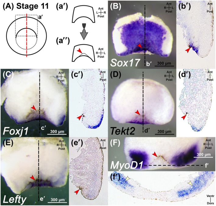 FIGURE 4. Molecular patterning of mid gastrula (stage 11). (A) Scheme of whole‐mount embryo, dorsal side up. Red line indicates the position of the sagittal sections. (a′) Scheme of dorsal explant, dorsal side up. (a″) Scheme of dorsal explant, ventral side up. (B, b′) Sox17 expression in the yolk cells, bottle cells and suprablastoporal endoderm involuted into the archenteron. (C, c′) Foxj1 expression in the superficial mesoderm. (D, d′) Tekt2 expression in the superficial mesoderm. (E, e′) Lefty expression in the deep axial mesoderm. (F, f′) MyoD1 expression in the deep paraxial mesoderm. Yellow arrowheads indicate zones of expression. Ant, anterior; Dors, dorsal, L, left; Post, posterior; R, right; Ventr, ventral. Dorsal explants (B–F) are viewed from ventral side, transverse sections through dorsal blastopore lip are sagittal (b′–e′) or cross (f′). Red arrowheads indicate bottle cells forming the front margin of achenteron.