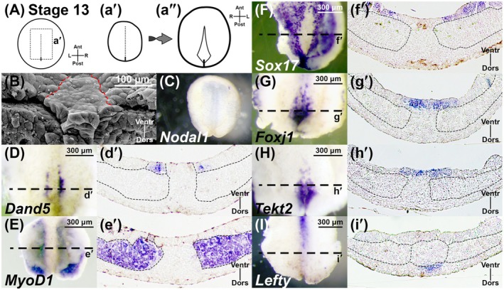FIGURE 8. Molecular patterning at the beginning of neurulation (stage 13). Formation of gastrocoel roof plate. (A) Scheme of whole‐mount embryo, dorsal side up. (a′) Scheme of dorsal explant, dorsal side up. (a″) Scheme of dorsal explant, ventral side up. (B) Scanning electron microscopy image of archenteron roof. (C) Nodal1 expression is yet undetectable. (D, d′) Dand5 expression emerges in the lateral cells of GRP. (E, e′) MyoD1 expression in the deep paraxial mesoderm. (F, f′) Sox17 expression in the yolk cells and the endoderm marking the marginal zone of archenteron. (G, g′) Foxj1 expression marks the GRP in the archenteron roof and the neural plate. (H, h′) Tekt2 expression marks the GRP in the archenteron roof. (I, i′) Lefty expression in the neural floor plate. Ant, anterior; Dors, dorsal, L, left; Post, posterior; R, right; Ventr, ventral. Dorsal explants (C–I) are viewed from ventral side, transverse sections through the explants are cross (B, d′–i′). Dot lines indicate cell separation.