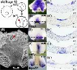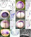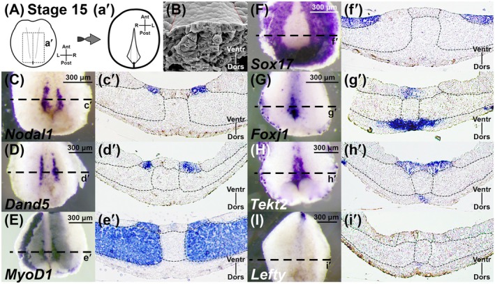 FIGURE 10. Molecular patterning at mid neurula (stage 15). (A) Scheme of whole‐mount embryo, dorsal side up. (a′) Scheme of dorsal explant, ventral side up. (B) Scanning electron microscopy image of GRP. (C, c′) Nodal1 expression in the lateral cells of GRP. (D, d′) Dand5 expression in the lateral cells of GRP. (E, e′) MyoD1 expression in the deep paraxial mesoderm and in the lateral cells of GRP. (F, f′) Sox17 expression in the endoderm. (G, g′) Foxj1 expression marks the medial part of GRP and the neural plate. (H, h′) Tekt2 expression marks the GRP and the neural plate. (I, i′) Lefty expression in the neural floor plate. Ant, anterior; Dors, dorsal, L, left; Post, posterior; R, right; Ventr, ventral. Dorsal explants (C–I) are viewed from ventral side, transverse sections through the explants are cross (B, c′–i′). Dot lines indicate cell separation.