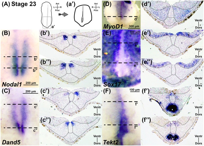 FIGURE 14. Molecular patterning at the tailbud stage (stage 23). (A) Scheme of whole‐mount embryo, dorsal side up. (a′) Scheme of dorsal explant, ventral side up. (B, b′, b″) Nodal1 expression in the lateral cells of GRP is gradually covered by endoderm layer. (C, c′, c″) Dand5 expression in the lateral cells of GRP. (D, d′) MyoD1 expression in the deep paraxial mesoderm and in the lateral cells of GRP. (E, e′, e″) The endoderm marked by Sox17 is covering the GRP. (F, f′, f″) Tekt2 expression marks the GRP, the neural plate and several cells in the ectoderm. Ant, anterior; Dors, dorsal, L, left; Post, posterior; R, right; Ventr, ventral. Dorsal explants (B–F) are viewed from ventral side, transverse sections through the explants are cross (b′–f″). Dot lines indicate cell separation.
